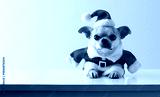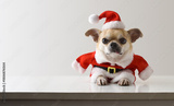 Chihuahua dog dressed Santa Claus suit lying down isolated gray