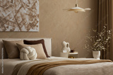 Cozy beige bedroom interior with layered textiles, neutral pillows and warm lighting.