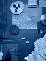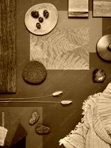 Green and earthy mood board featuring wood, stone, dried plants, and natural fabrics. A nature-inspired interior design concept.