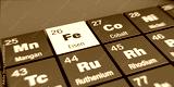 Detail view of chemical element Fe Iron (German: Eisen) with the atomic number 26 within the periodic table of elements in German. Dynamic dispersion effect at the corners and shallow depth of field.