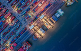 Logistics and transportation of Container Cargo ship and Cargo plane with working crane bridge in shipyard at sunrise, logistic import export and transport industry background