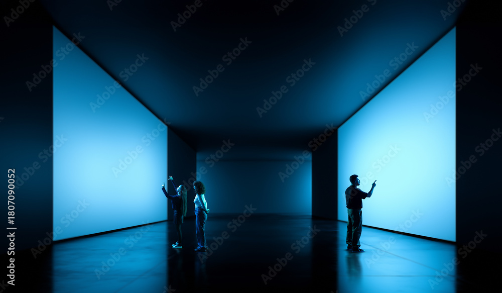 Neon surreal design. People interacting with large glowing blue screen walls in futuristic minimal corridor. Concept of tech display spaces, AI-enhanced backgrounds, and immersive digital visuals.