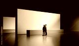 Collage of futuristic gallery interior with glowing gradient walls and two women observing digital display. Concept of digital setups, tech backgrounds, AI installation visuals, and modern spaces.