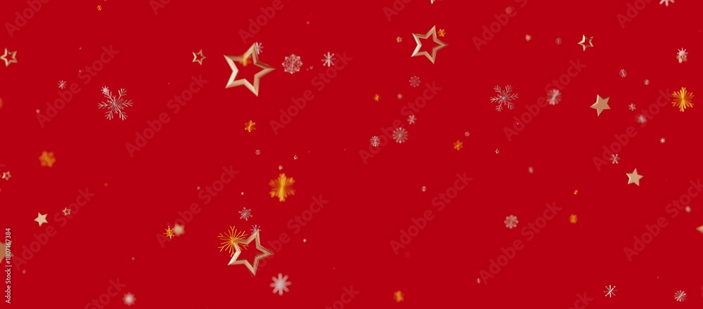 Christmas background with gold stars and snowflakes falling on a vibrant red backdrop. Perfect for seasonal designs, holiday