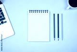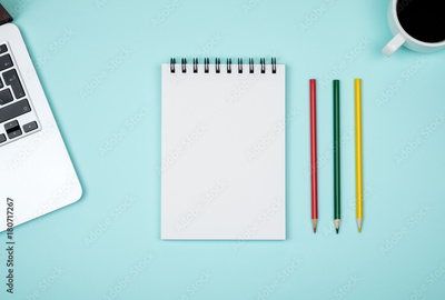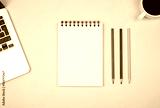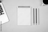Modern designer office desk table with blank notebook page, laptop computer and cup of coffee