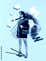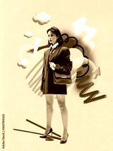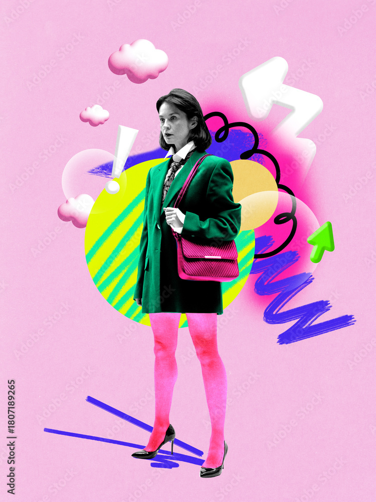 Retro-styled fashion collage of woman in green blazer with curious emotion. Concept of fashion campaigns, lifestyle blogs, retail promo layouts, creative magazine covers, youth-oriented branding.