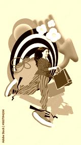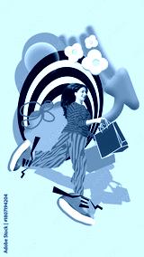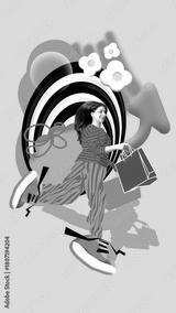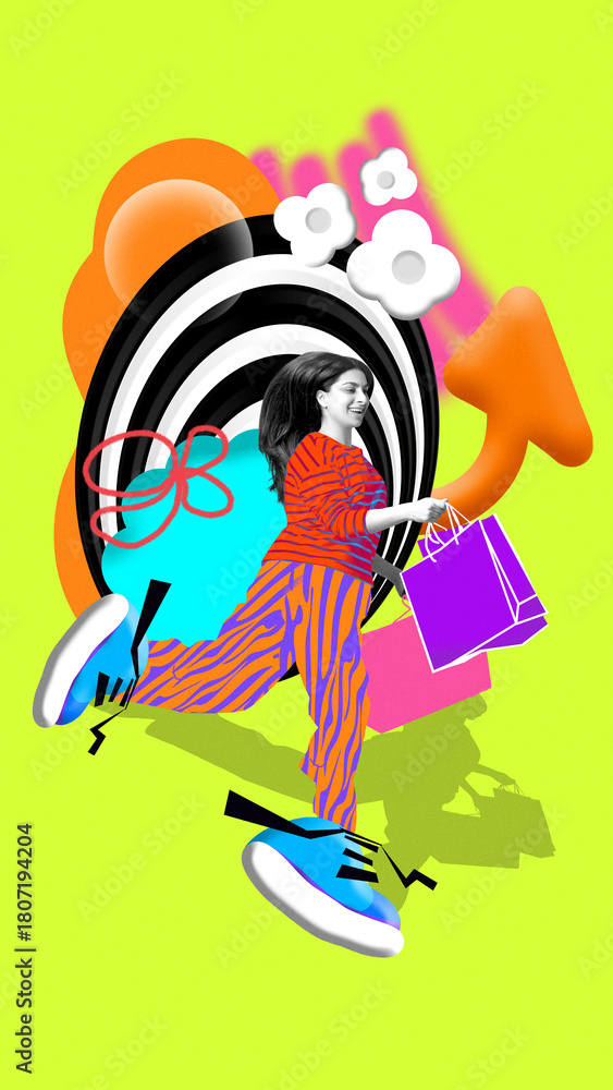 Vibrant collage of running woman with shopping bags and happy emotion. Concept of e-commerce ads, seasonal retail campaigns, mall promotions, shopping app visuals, dynamic sale banners.
