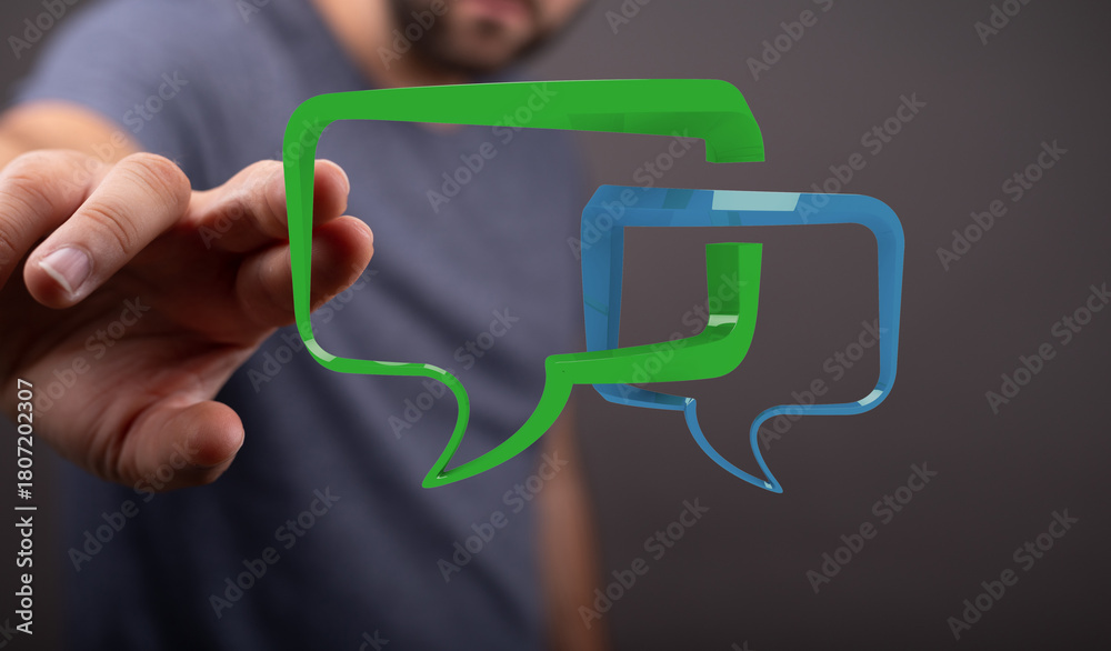 A person interacts with colorful 3D chat bubbles, symbolizing online conversations, digital communication, and