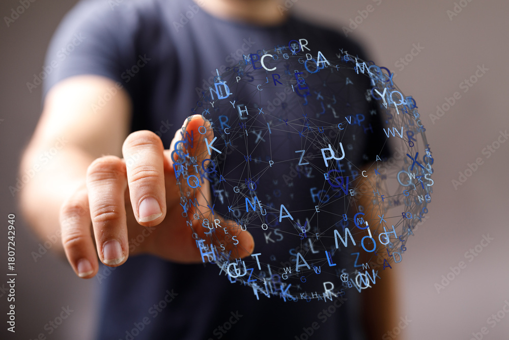 Close-up of a hand interacting with a digital sphere of letters, representing concepts like networking and info