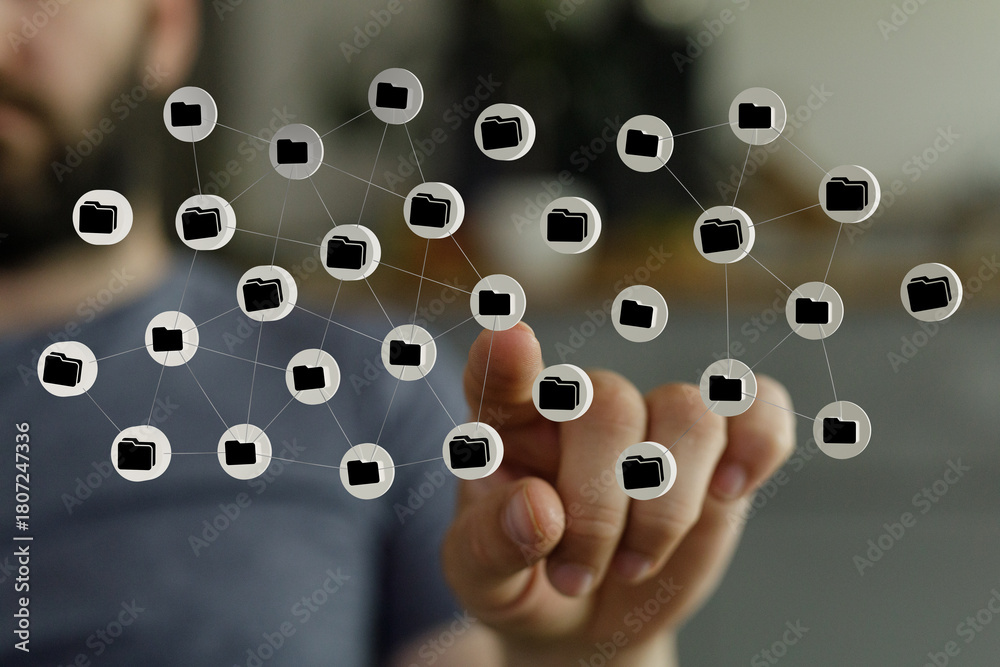 A person touching a network of data folders, representing data transfer, technology, and connectivity.