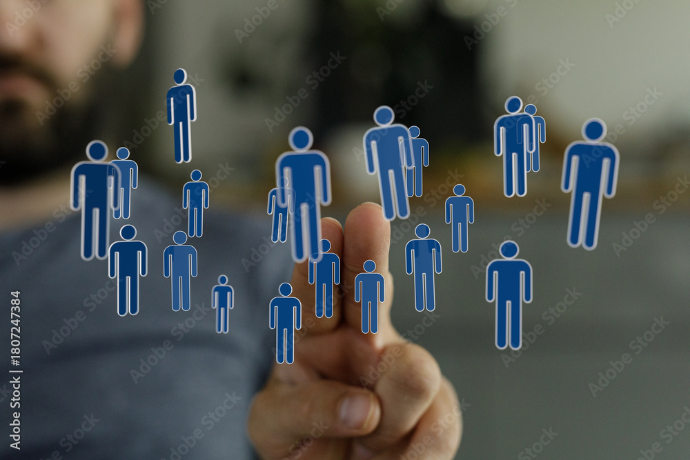 A finger interacting with digital human icons, illustrating collaboration and connection. Represents teamwork,