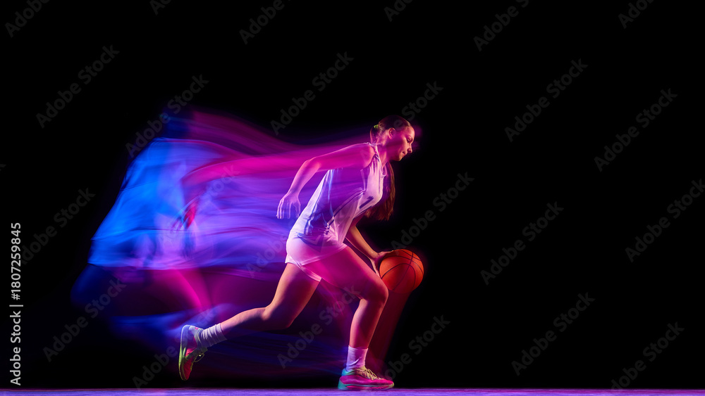 Female athlete dribbling basketball with glowing motion trail. Concept of fitness promotion, energetic lifestyle, sports advertising, body in motion, and modern visual campaigns.