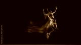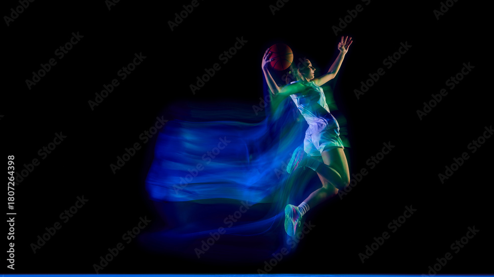 Female basketball player jumping high with glowing ball trail. Concept of athletic performance, activewear marketing, sports product visuals, and fitness campaign promotion.