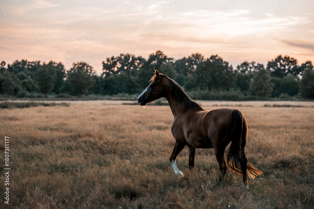 beautiful chestnut horse in dusk in the field pasture pretty outside equine photograph