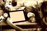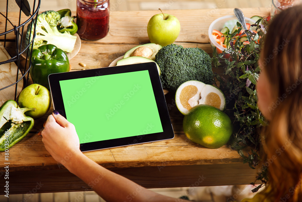 Woman showing a tablet with a green display at the kitchen table with fresh green vegetables and fruits, chroma copyspace