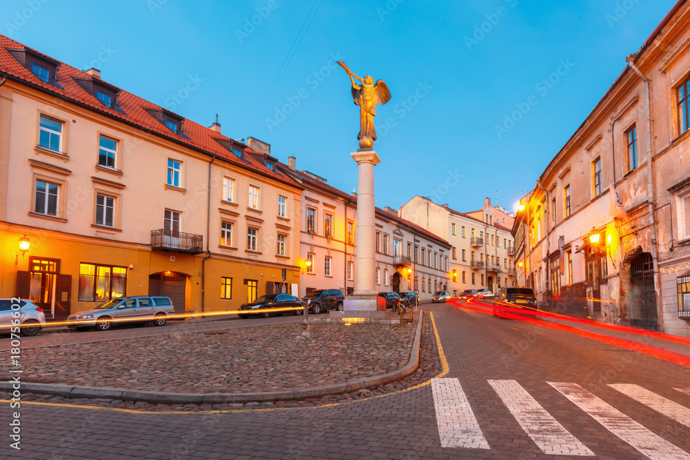 Uzupis Angel, statue of an angel blowing a trumpet in the main square, symbol quarter of an independent republic Uzupis, during evening blue hour, Vilnius, Lithuania, Baltic states.