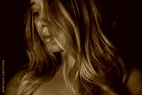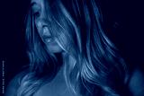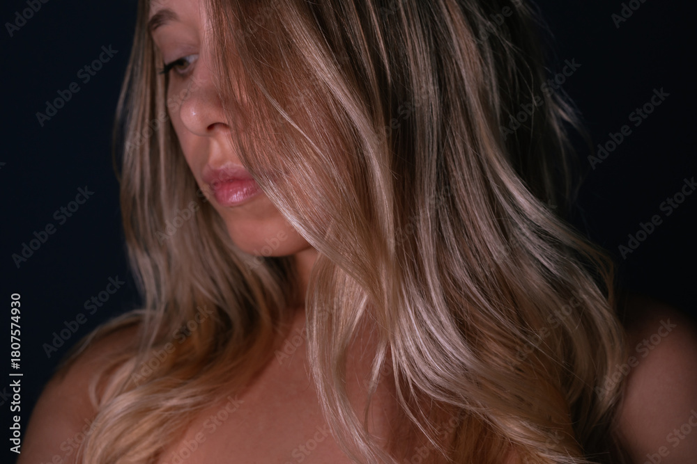 Close-up of a young woman with healthy wavy blonde hair, soft shine and smooth texture, captured on a dark background for beauty and haircare concepts