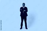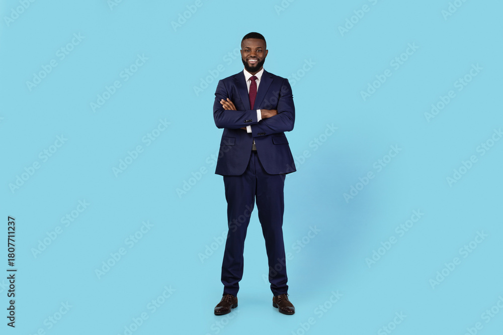 Portrait Of Confident Young Black Businessman In Suit Standing With Folded Arms, Handsome African American Male Entrepreneur Posing Over Blue Studio Background, Full Length, Copy Space
