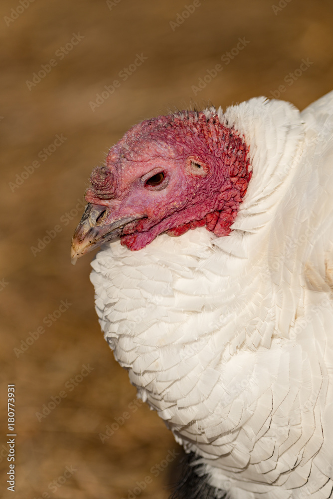Close up of a Royal Palm black and white feathered turkey with a shallow depth of field