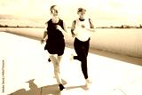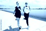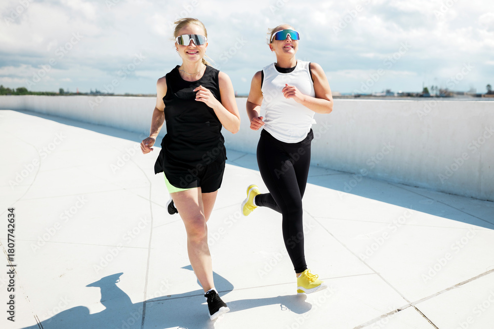 Two friends enjoy a run on a sunny rooftop