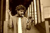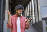 A worried young Indian man stands on the street outside an office building and stares in dismay at the screen of the phone he holds in his hand
