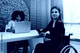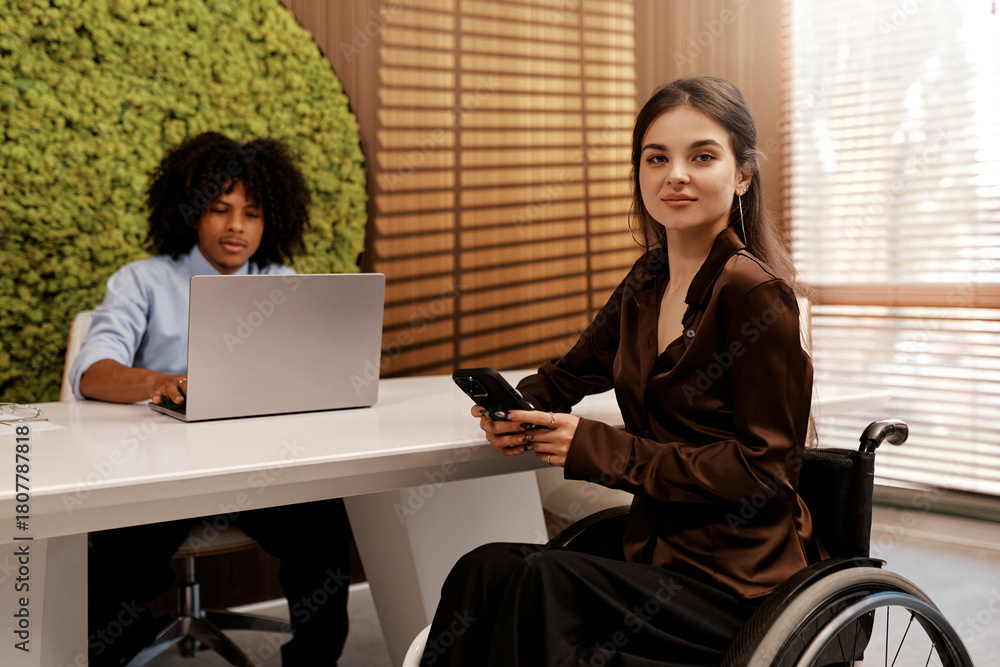 Young woman in wheelchair using smartphone at modern office table