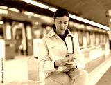 Girl sitting at subway stop, underground station platform, during waiting for transport she scrolling through social media feed, reads news online