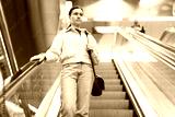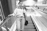 Woman metro passenger is on escalator, enters underground public transport station, moves on escalator, stands on moving steps.