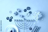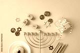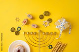 Bright Hanukkah scene features a central menorah, dreidel, coins, a gift box, and Star of David motifs on a vibrant yellow backdrop