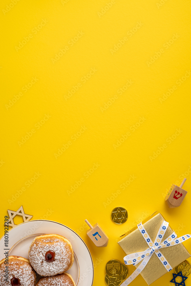 Bright vertical Hanukkah scene with donuts dusted in sugar, a dreidel, star of david charm, and a wrapped gift on a vibrant yellow backdrop