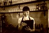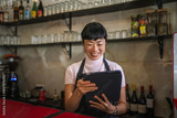 Asian woman waitress smiling using digital tablet in cafe