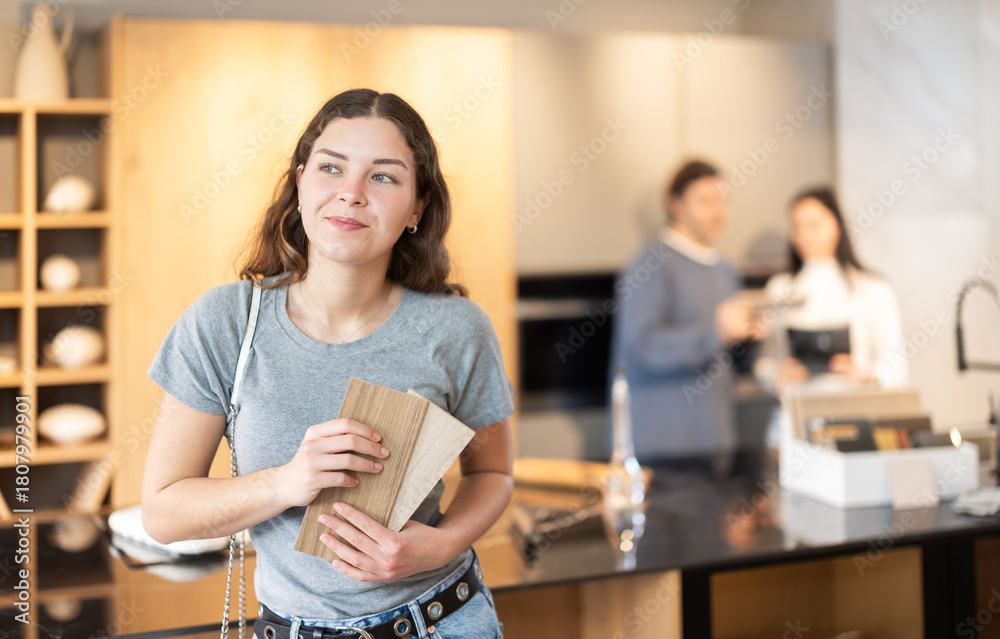 Female buyer with samples of material chooses kitchen set in a furniture store