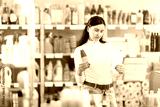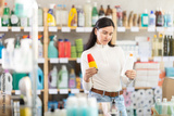 European woman stands against the background of shelves with household goods and holds sunscreens in her hands.