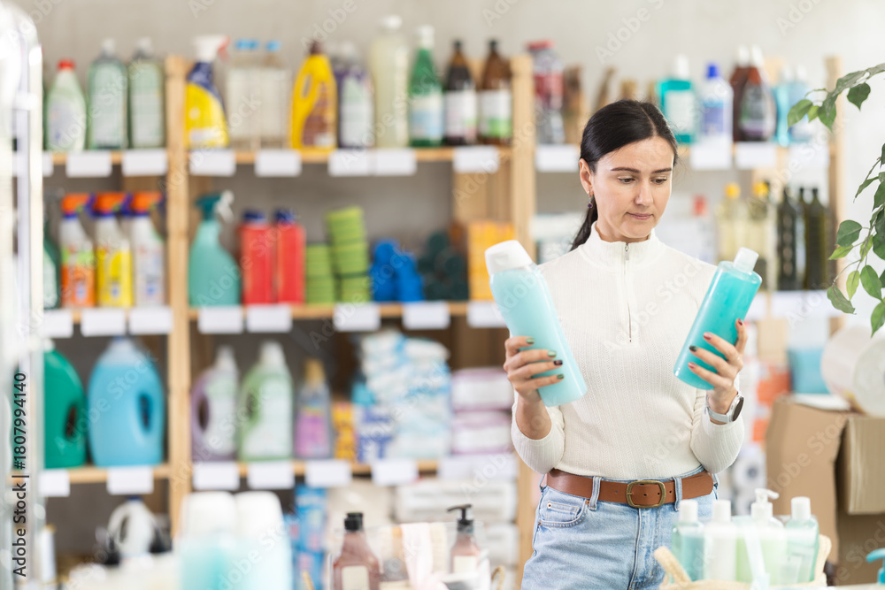 Middle-aged European woman chooses a shampoo for all hair types and a moisturizing gel for the body. Customer looks at hair and body care products in the household department of a supermarket