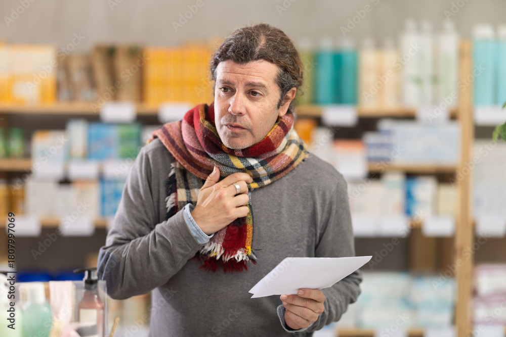 Adult man buyer with sore throat and cough choosing prescription pills in pharmacy