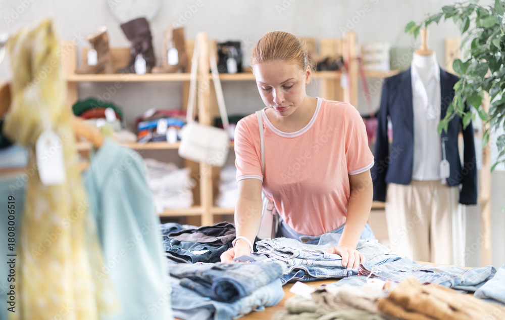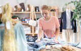 Attentive teenage girl choosing pantaloons in clothing shop with large assortment