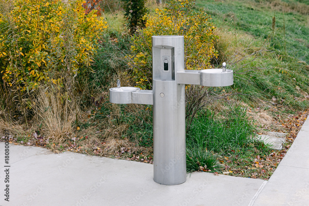 Modern stainless steel water fountain in a park surrounded by green plants and trees during a sunny day