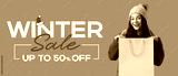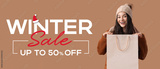 Beautiful young woman in warm clothes with shopping bag on brown background