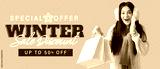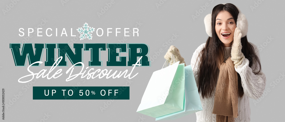 Beautiful young woman in warm clothes with shopping bags on grey background