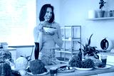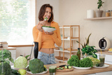 Beautiful young happy woman with different vegetables, glasses of healthy green smoothie and salad in kitchen