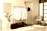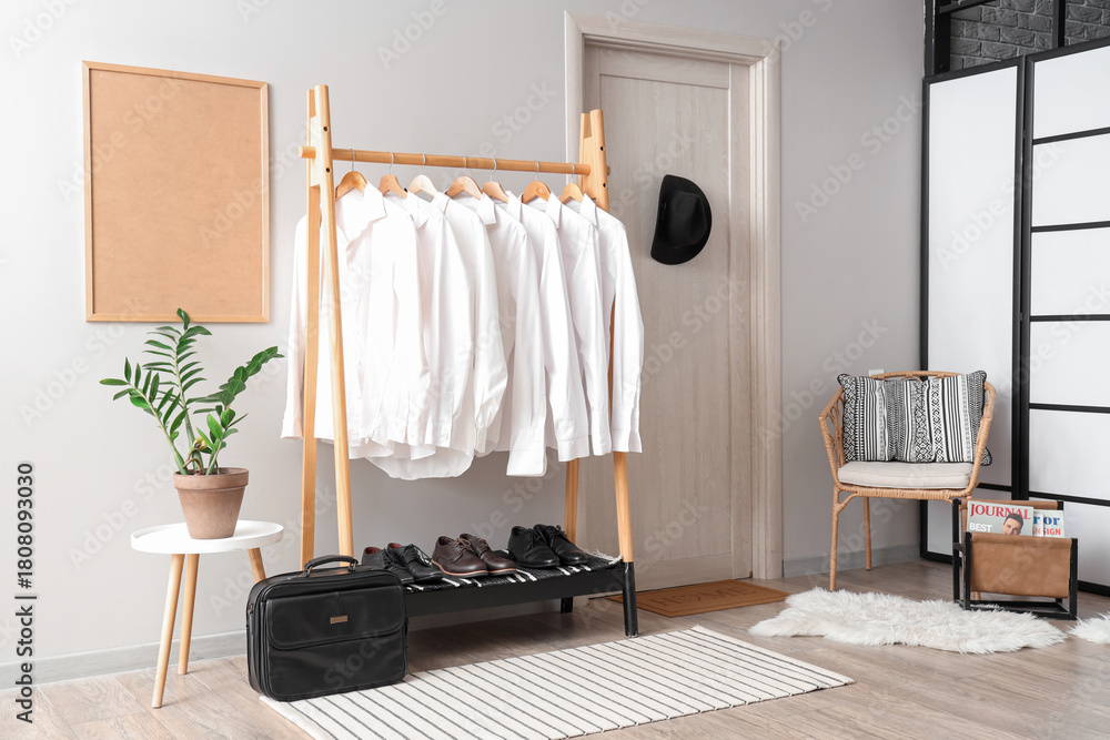 Rack with man's shirts near white wall in room