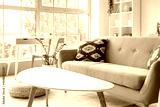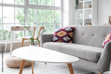 Interior of living room with grey sofa and tables