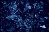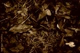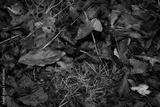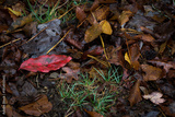 Single bright red leaf in wet leaf litter over tufts of grass, horizontal aspect