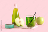 Bottle and glass of lemonade with chia seeds and apples on pink background