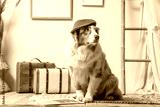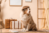 Cute Australian Shepherd dog in beret with different decor near beige wall in living room
