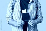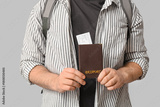 Young man holding passport with air ticket on grey background, closeup. Travel concept