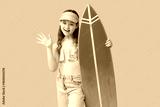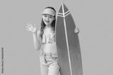 Happy girl with surfboard waving hand on blue background