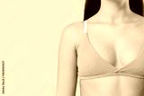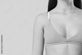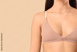 Beautiful young woman in cotton bra on beige background, closeup