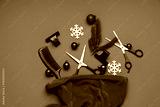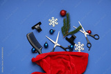 Santa bag with hairdresser's supplies and Christmas decor on blue background
