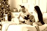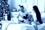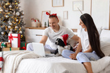 Young couple with dog using laptop in bedroom on Christmas eve